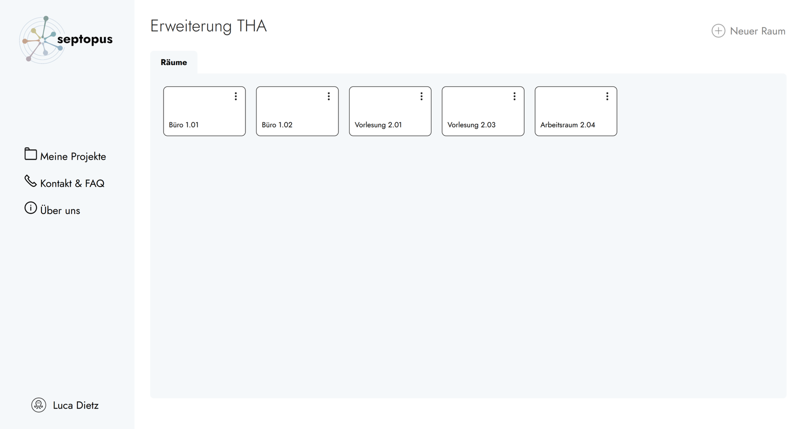 Nach der Auswahl eines Projekts gelangen die Nutzenden auf eine in Struktur und Gestaltung nahezu identische Seite, die das Anlegen und Verwalten von Räumen innerhalb des gewählten Projekts ermöglicht.