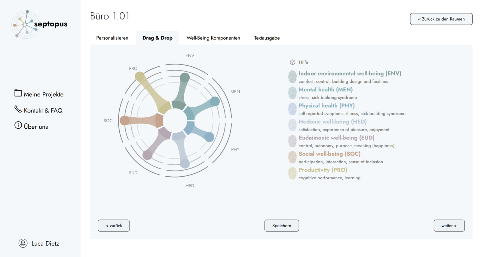 Das webbasierte Tool Septopus wurde im Rahmen eines Bachelorprojekts im Studiengang Digitaler Baumeister an der Technischen Hochschule Augsburg unter meiner Anleitung entwickelt. Die konzeptionelle Ausarbeitung sowie das gestalterische Design wurden im Rahmen meiner Masterarbeit von mir betreut und weiterentwickelt. Die grundlegende Idee, die Kategorien des Wellbeing mit der Visualisierung des Septopus zu verknüpfen, wurde bereits in einer früheren Arbeit von Bjelland entwickelt und bildet den Ausgangspunkt für die hier vorgestellte Weiterentwicklung (Bjelland und Schmidt 2022).