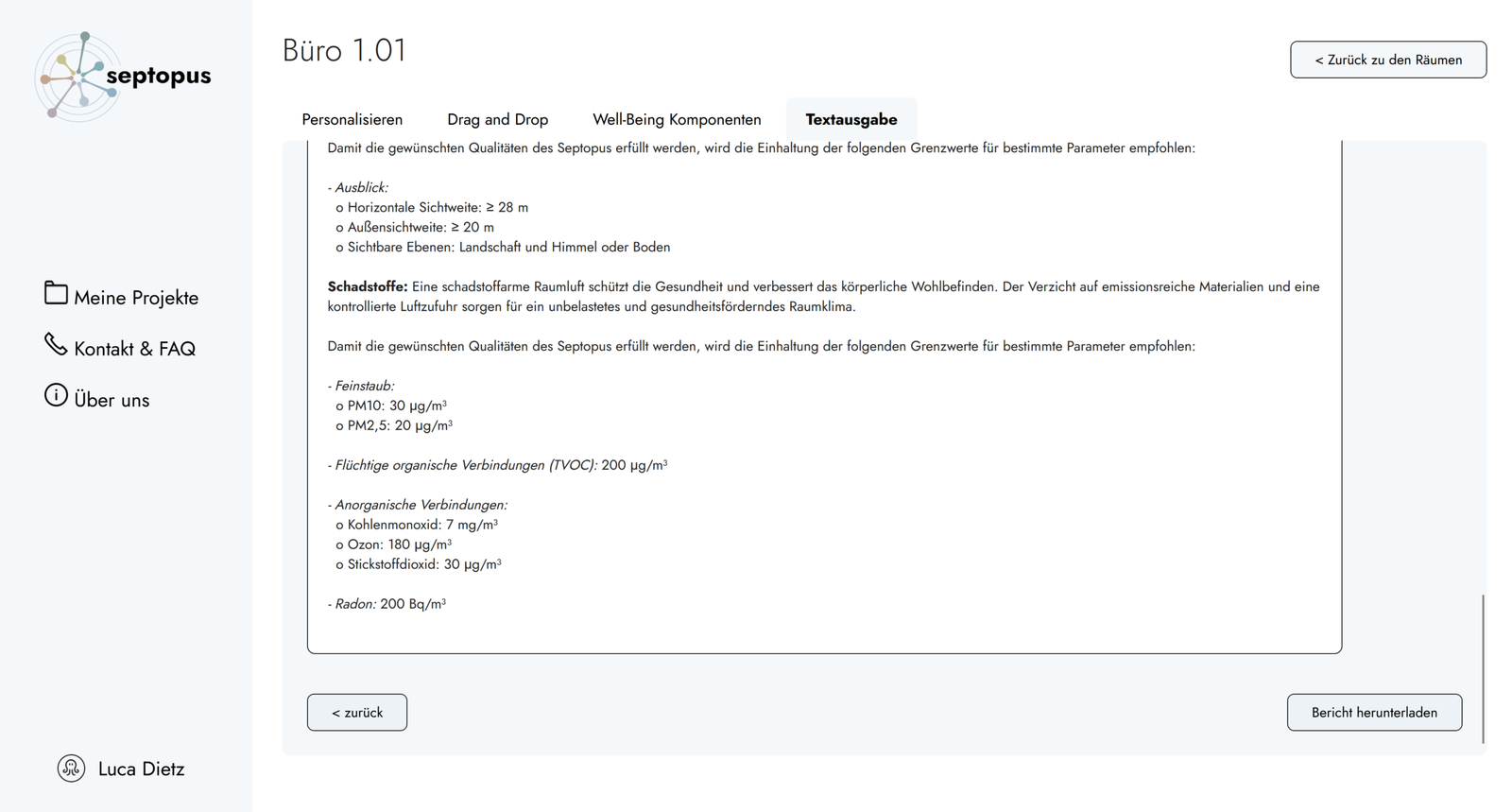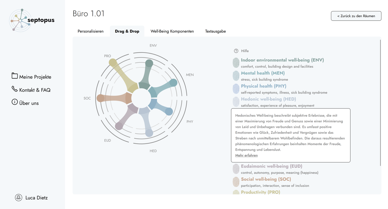 Das Tool entwickelt eine eigenständige Systematik zur Strukturierung von Komfort, Gesundheit und Wellbeing. Komplexe Zusammenhänge werden in sieben Kategorien übersetzt und in eine intuitive, visuell zugängliche Form (”Septopus”) überführt.