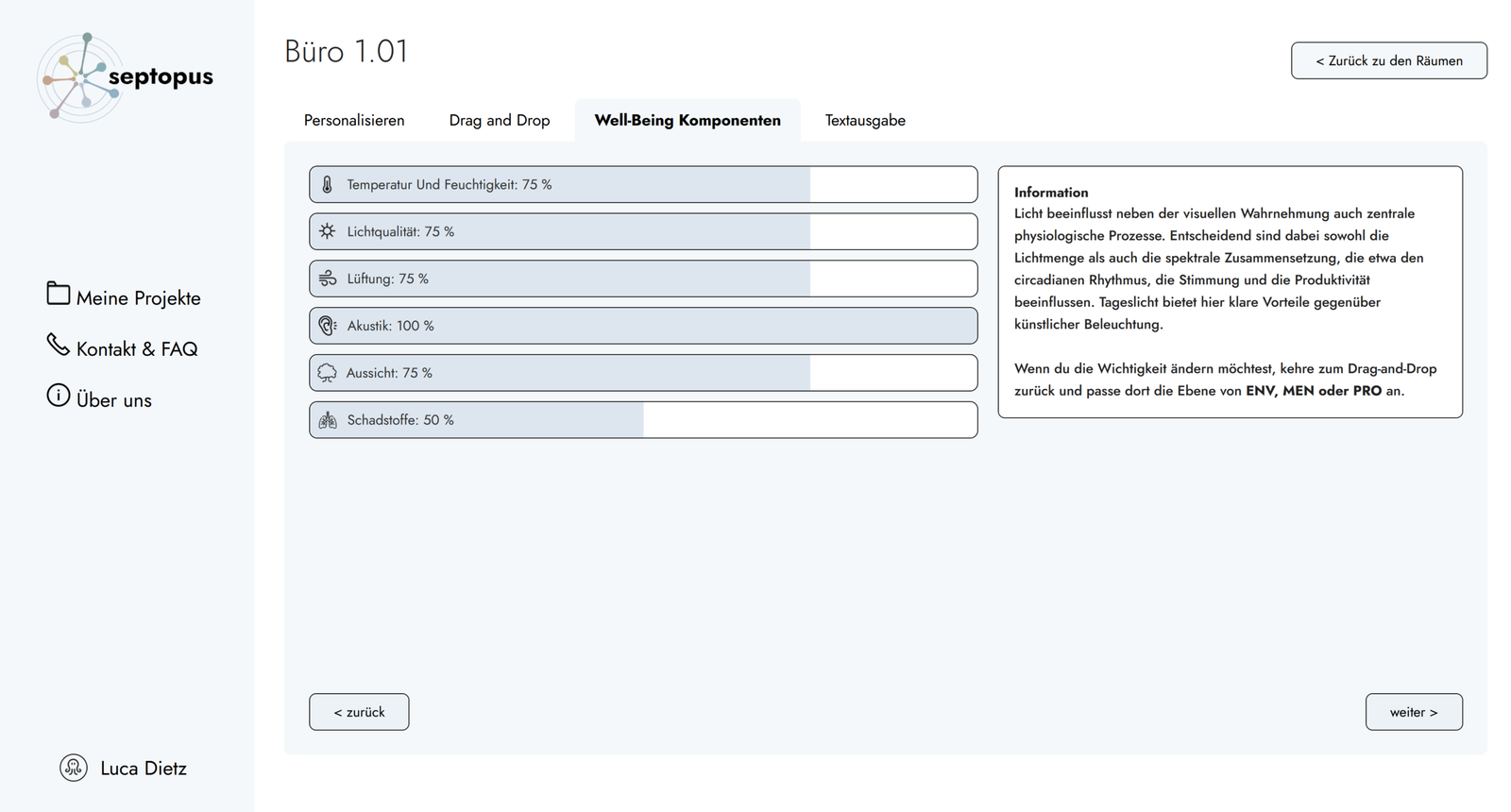 Die Visualisierung des Septopus bildet das zentrale Gestaltungselement der Identität des Tools und prägt maßgeblich dessen Wiedererkennungswert. Gleichzeitig erfüllt sie eine funktionale Rolle, indem sie den Einstieg in die individuelle Zieldefinition der Räume ermöglicht. Mithilfe einer Drag-and-Drop-Funktion können Nutzende die gewünschten Ausprägungen für jede der sieben Kategorien festlegen. Die zugrunde liegende Komplexität wird dabei bewusst reduziert, indem eine Vielzahl von Parametern auf sieben intuitive Einstelloptionen verdichtet wird. Für jede Kategorie kann der angestrebte Erfüllungsgrad in vier Stufen gewählt werden. Die Auswahl erfolgt auf Basis individueller Wünsche und Präferenzen, ohne dass spezifisches Vorwissen erforderlich ist.