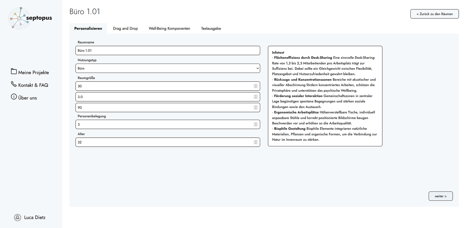 Das Septopus-Tool ist aus dem Anspruch entstanden, meine theoretisch erarbeiteten Grundlagen des Human-centered Design nicht nur zu analysieren, sondern aktiv anwendbar zu machen. Es überführt theoretische Erkenntnisse in eine operative Struktur und schafft damit ein neues Instrument für die Bedarfsplanung. Ziel war es, komplexe Wechselwirkungen zwischen Komfort, Gesundheit, Wellbeing und räumlicher Qualität in eine Form zu bringen, die nicht nur verstanden, sondern unmittelbar angewendet werden kann.