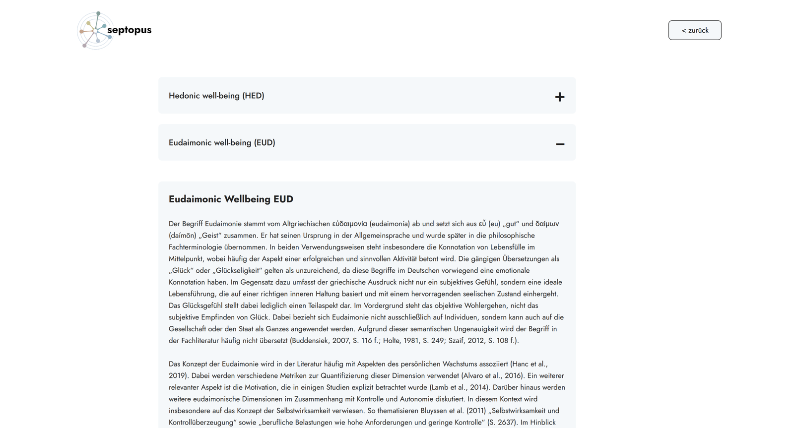 Das webbasierte Tool Septopus wurde im Rahmen eines Bachelorprojekts im Studiengang Digitaler Baumeister an der Technischen Hochschule Augsburg unter meiner Anleitung entwickelt. Die konzeptionelle Ausarbeitung sowie das gestalterische Design wurden im Rahmen meiner Masterarbeit von mir betreut und weiterentwickelt. Die grundlegende Idee, die Kategorien des Wellbeing mit der Visualisierung des Septopus zu verknüpfen, wurde bereits in einer früheren Arbeit von Bjelland entwickelt und bildet den Ausgangspunkt für die hier vorgestellte Weiterentwicklung (Bjelland und Schmidt 2022).